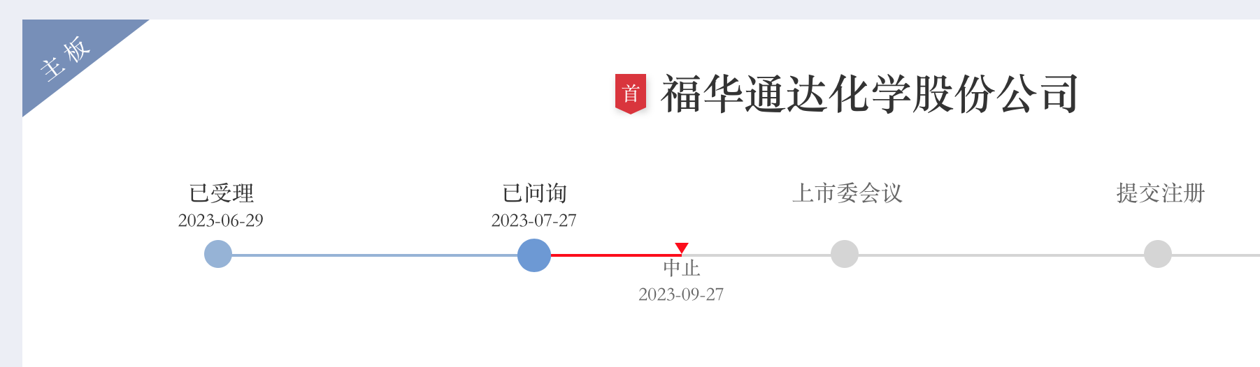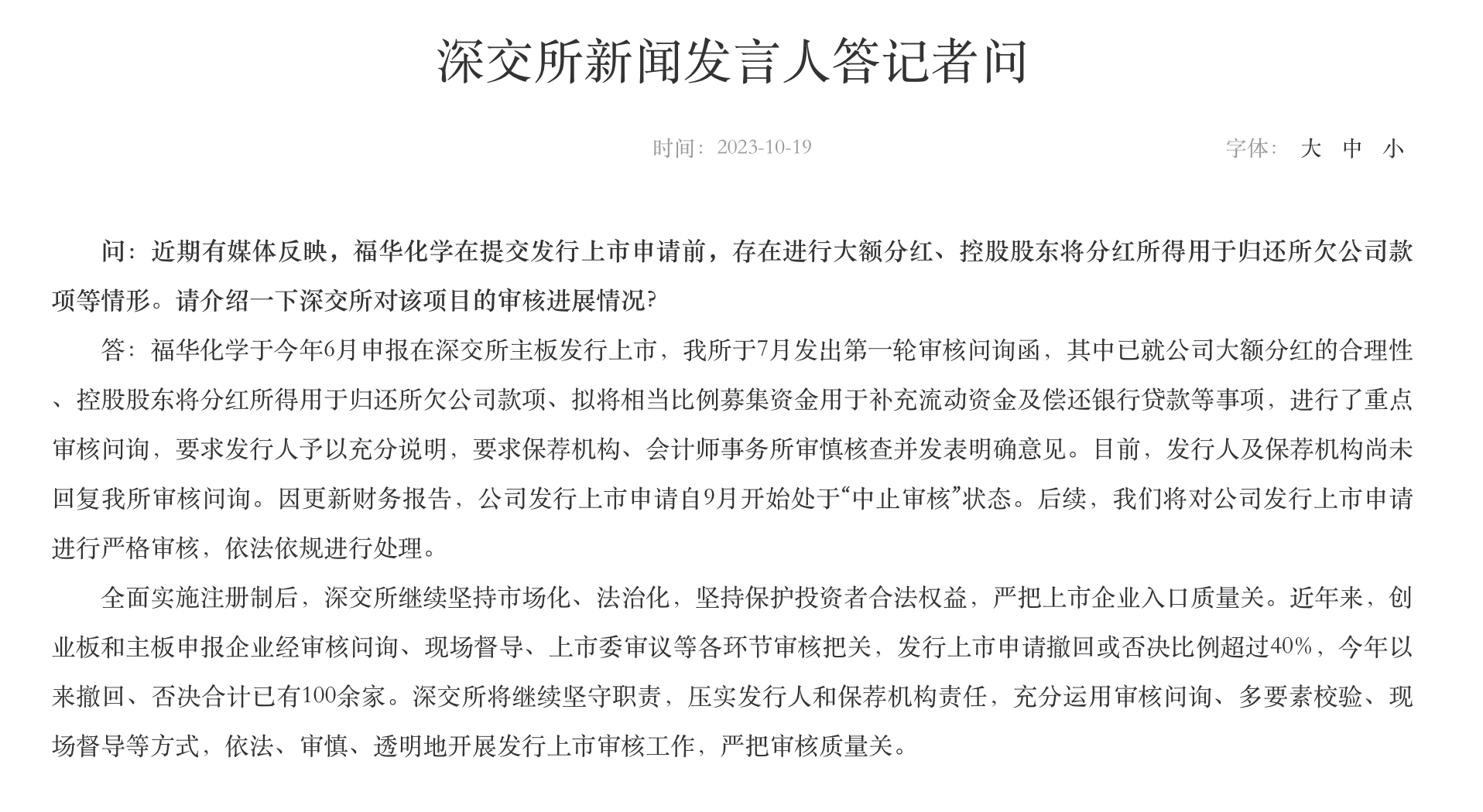 据深交所回应,福华化学于今年6月申报在深交所主板发行上市,深交所于7月发出第一轮审核问询函,其中已就公司大额分红的合理性、控股股东将分红所得用于归还所欠公司款项、拟将相当比例募集资金用于补充流动资金及偿还银行贷款等事项,进行了重点审核问询,要求发行人予以充分说明,要求保荐机构、会计师事务所审慎核查并发表明确意见。目前,发行人及保荐机构尚未回复交易所审核问询。因更新财务报告,公司发行上市申请自9月开始处于“中止审核”状态。后续,深交所将对公司发行上市申请进行严格审核,依法依规进行处理。