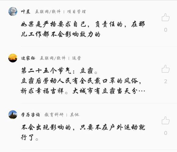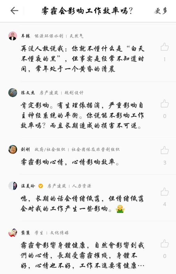 当然,也有许多爱岗敬业的小伙伴表示,虽然讨厌雾霾,但工作并没有被耽搁。许多公司也人性化地安排了在家办公,缓解了员工对外出上班的厌恶情绪。“雾霾只耽误了我的玩耍时间,工作还是照常”“除了多戴个口罩,我已经习惯了,雾霾天上班和平时没什么区别,特别呆在室内,本来也看不见窗外的景色”“在家办公三天,在哪不重要,活要按时交”“单双号限行反而节省了大量上下班的时间”“在家办公,节约了1小时交通”……