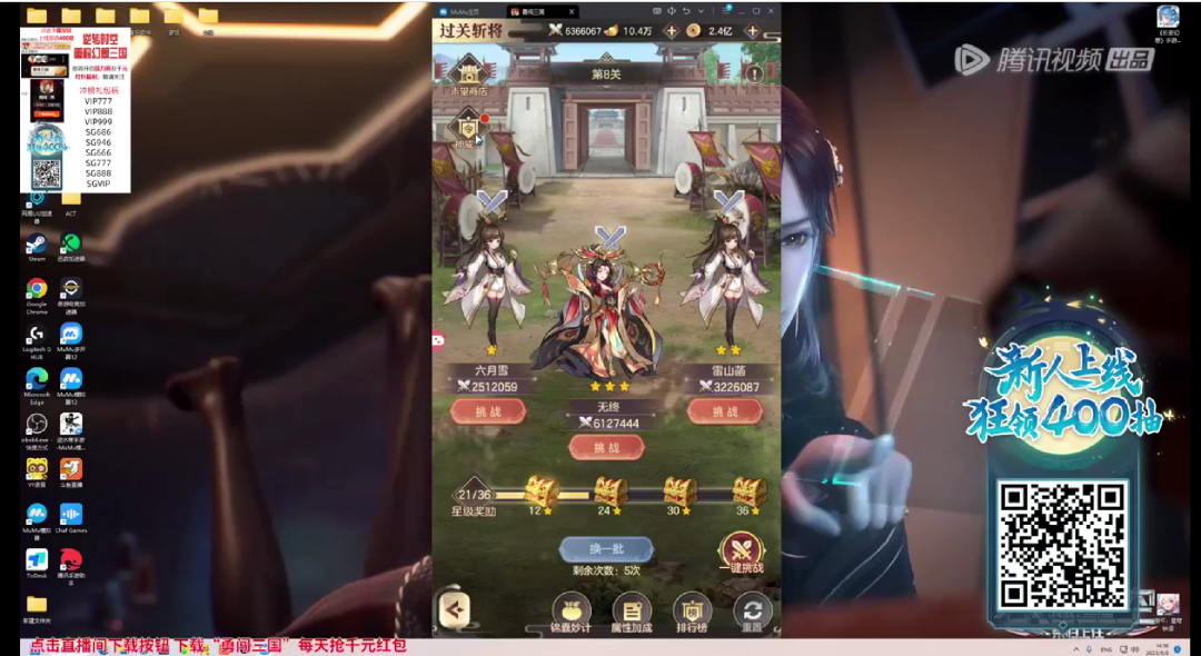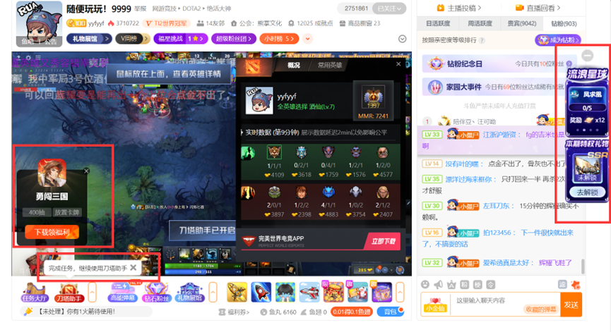 然后是直播页面的“左右护法”,左边的活动竖幅,右边的游戏弹窗,以及直播右下角随机弹出来所谓的“你已经达到免费领取XXX鱼翅”的弹窗广告。