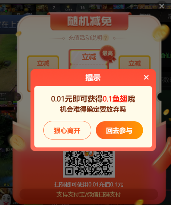 我要先把弹出来的所谓随机减免充值活动关闭,且还要经过点X再点狠心离开才能关闭,值得一提的是,这个活动几乎每个人都能随机减免到90%,但我也没看过0.1鱼翅(原价约等于1毛钱)以外的金额优惠。