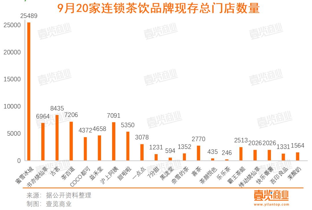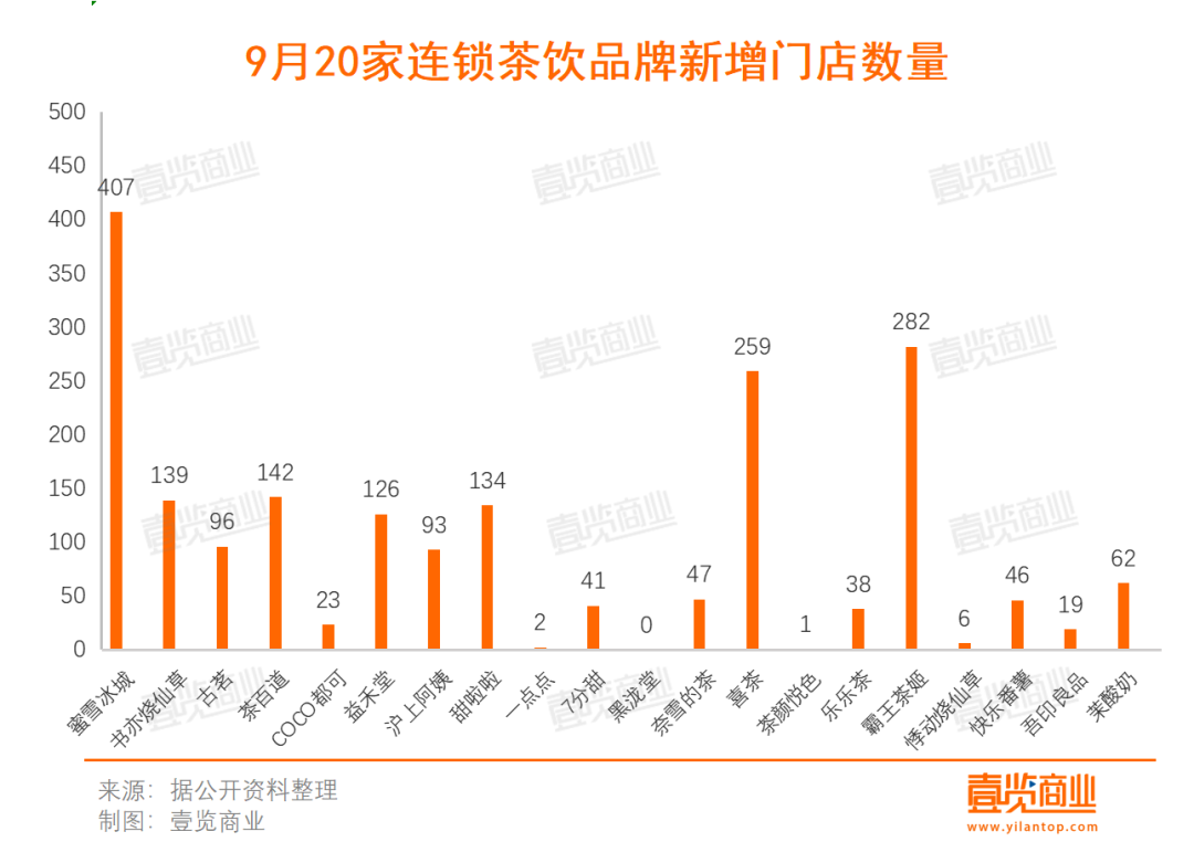 9月份,壹览商业长期跟踪的国内20家连锁茶饮品牌共新开门店数量与上月相比减少592家。