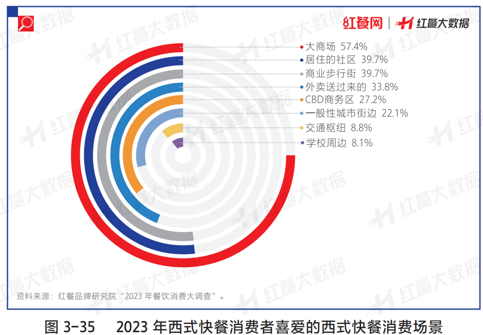 在消费渠道上,西式快餐已发展出较为多样的渠道。大商场店、社区店、商业步行街店、外卖都是西式快餐的主流消费渠道。“2023年餐饮消费大调查”数据显示,选择在大商场店就餐的西式快餐消费者占比最高,为57.4%;选择社区店和商业步行街门店的西式快餐消费者占比相当,均为39.7%;选择点外卖的西式快餐消费者则达到了33.8%。
