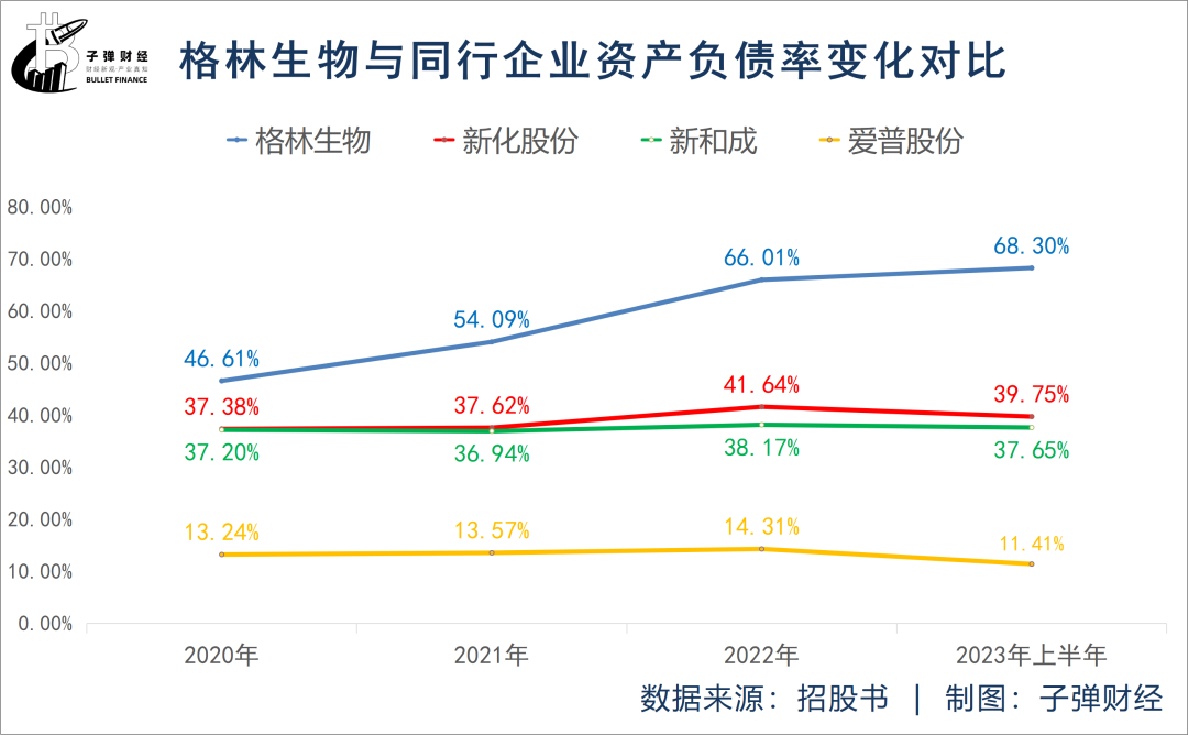2020年至2023年上半年各期末,格林生物资产负债率呈现逐年攀升的态势,从2020年的46.61%增长至2023年上半年的68.3%,远高于同行业新化股份、华业香料、爱普股份、新和成等上市公司。