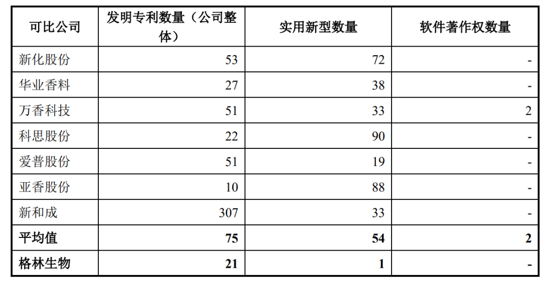拿研发方面来说,目前,格林生物共有21项发明专利,均为2019年及以前获得,自2020年至2023年6月,格林生物有3项发明专利提交申请,均在审核中。此外,与新化股份、华业香料、万香科技等同行业公司相比,格林生物的发明专利也相对较少,行业可比公司发明专利均值为75个,而格林生物仅有21个。