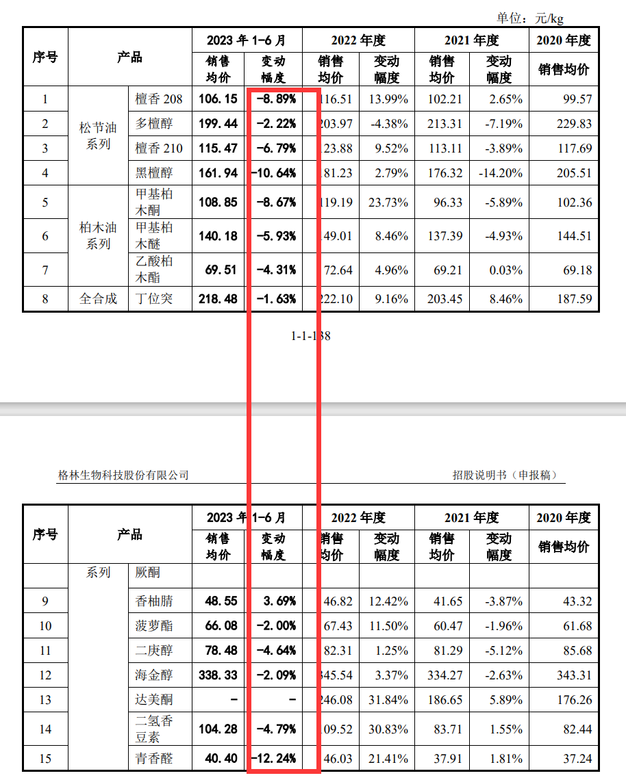 究其原因,产能释放只是其中一方面原因,另一方面的原因则是格林生物采用了“以价换量”的方式提振业绩。今年以来,格林生物的主要产品松节油系列、柏木油系列、全合成系列的14类产品均降价出售,其中,黑檀醇、青香醛两种产品价格较去年调低了超十个百分点。