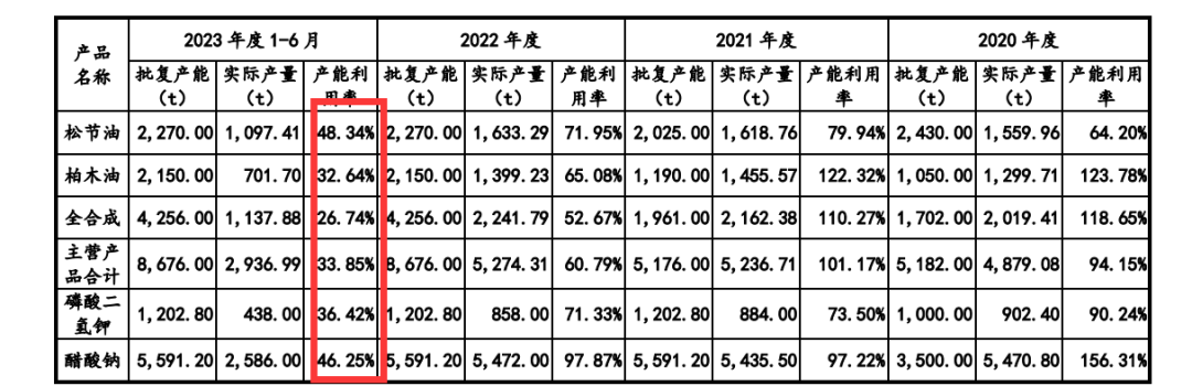 不过,从2023年上半年的产能利用率来看,格林生物的产能利用率并不高。其中,松节油系列、柏木油系列、全合成系列产品的产能利用率均在50%以下。