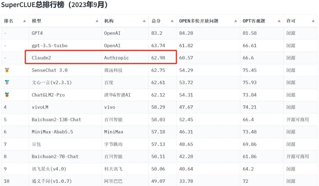 受到谷歌、亚马逊青睐的Anthropic究竟有何背景?先来参考一下中文通用大模型综合性评测基准SuperCLUE发布的9月榜单。测试结果显示,Anthropic推出的Claude 2总分仅次于OpenAI的GPT-4和GPT-3.5,位列第三。