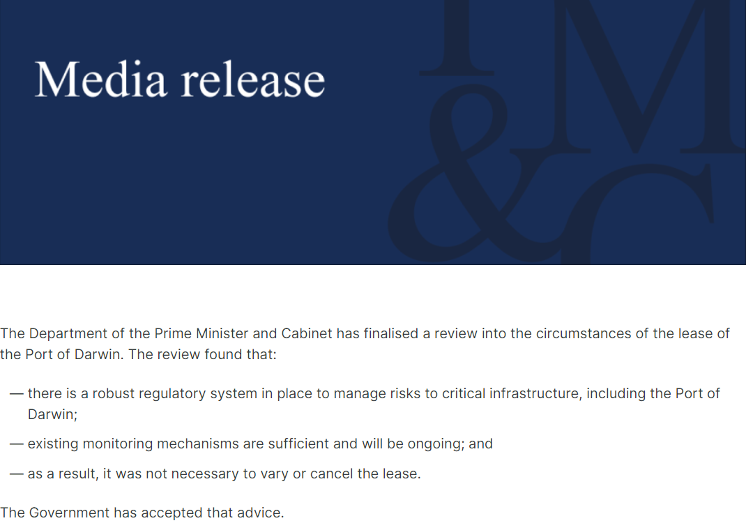 澳大利亚总理及内阁部10月20日发布声明称,已完成对该国北部达尔文港租赁情况的审查,认为没有必要更改或取消租约。