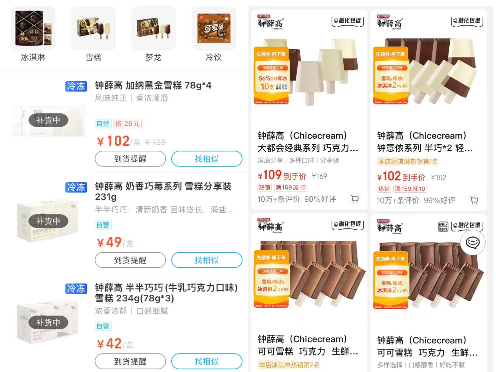 界面新闻在各大生鲜电商平台上发现,盒马、永辉和叮咚买菜等渠道已经没有钟薛高的产品出售;不过在钟薛高的自营渠道,如天猫期舰店和京东旗舰店,产品仍然在正常销售。