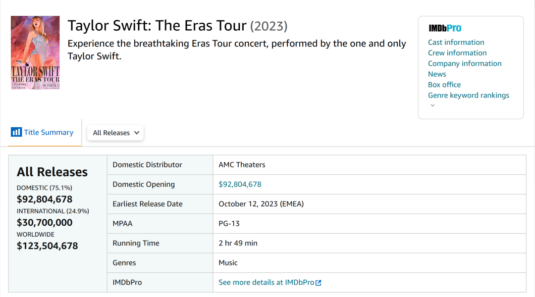 电影全球首周收获1.3亿美元票房,打破2011年的《贾斯汀·比伯:永不言败》演唱会电影的票房成绩7300万美元,仅用3天成为史上第一部票房破亿美元的演唱会电影。有票房分析师预测,该片最终有4亿美元票房,而今年只有《芭比》和《超级马力欧兄弟大电影》超过了这一数字。
