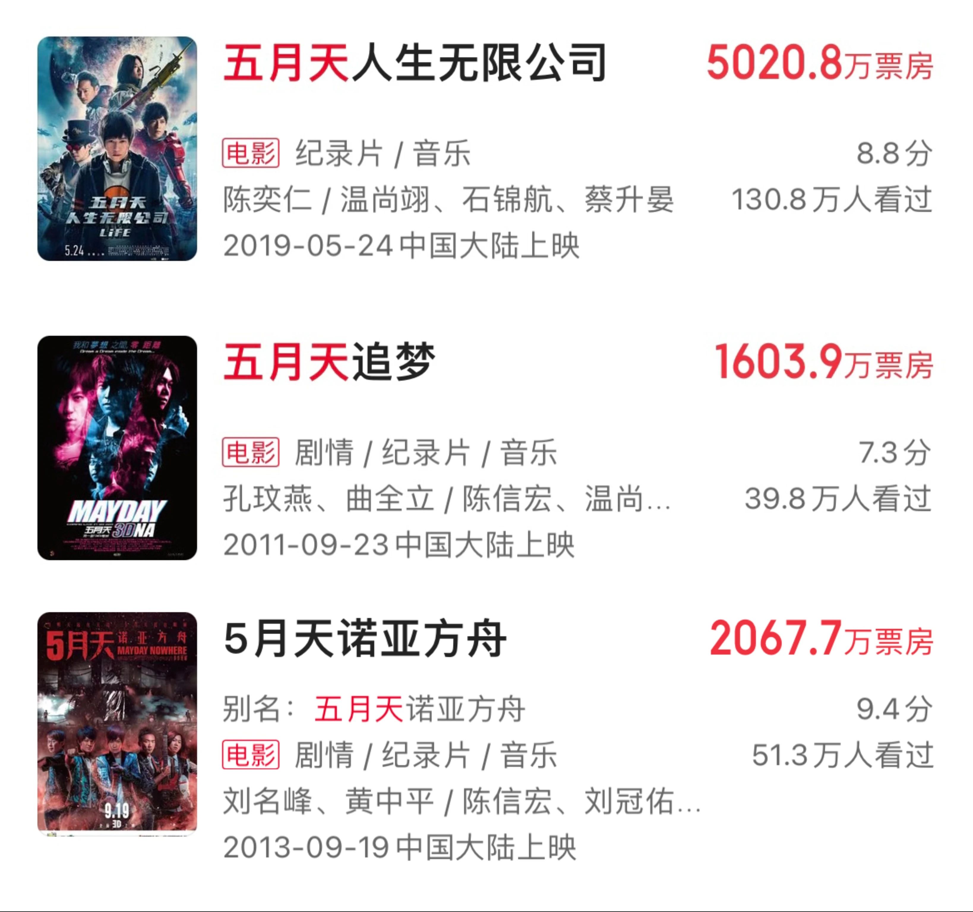 同样,国内也深谙演唱会电影的宣传优势。相信音乐的谢芷芬曾在采访中说过,五月天的《DNA》巡演44场,观众人次100多万,《诺亚方舟》开了71场,观众人次248万,正是因为有了之前那部电影的推广,吸引了更多之前没看过他们演唱会的人。