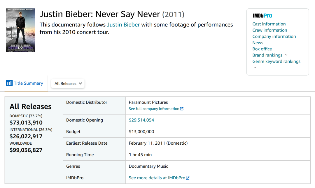 以《贾斯汀·比伯:永不言败》为例,投资成本1300万美元,票房成绩7300万美元,净利润2000万美元。更何况,一般来说,一部演唱会电影的成本在几十万至几百万美元之间,宣传成本更低,选择在演唱会宣传周期内即可。