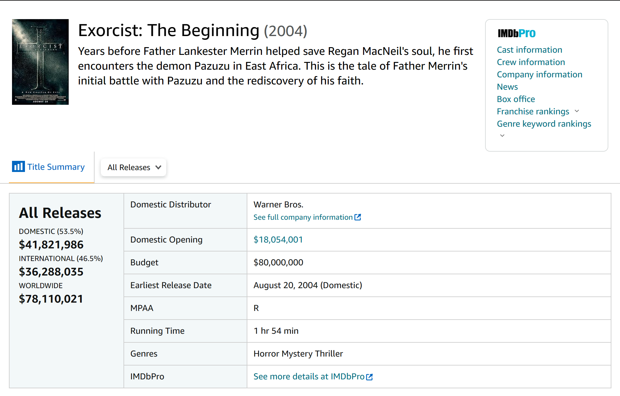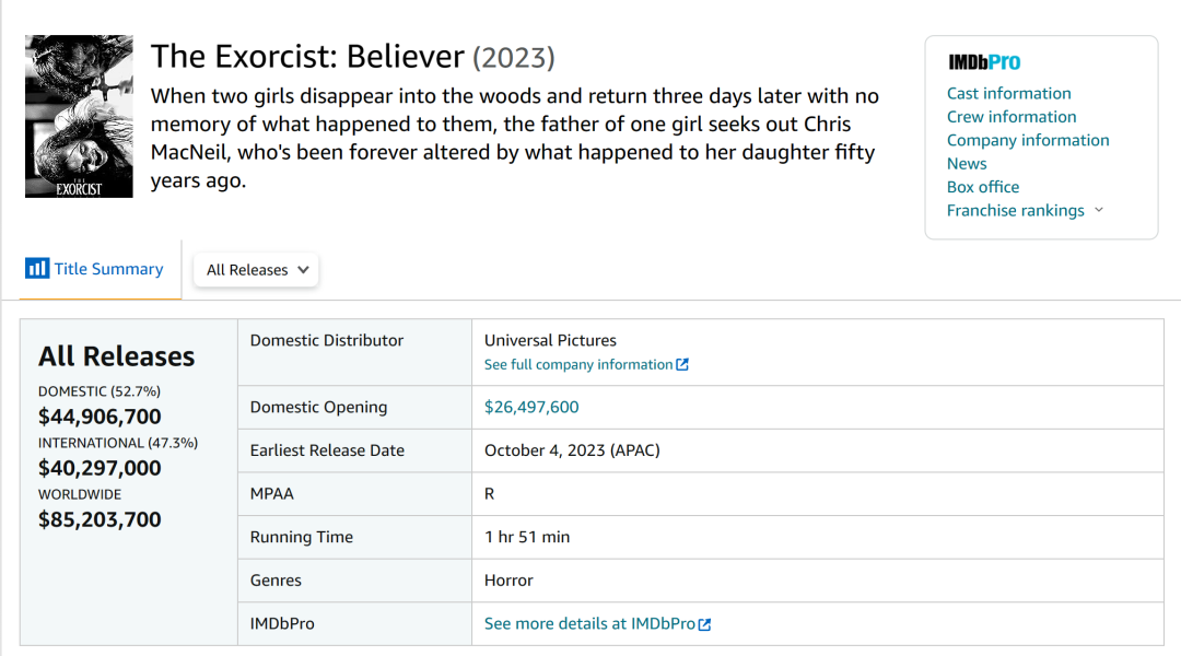这一成绩显著高于19年前的《驱魔人前传》(1805万美元),在该系列的重启作品中占据先机。但在今年亮相的恐怖片中,《驱魔人:信徒》的表现难言突出,排在《惊声尖叫6》、《潜伏5:红门》、《修女2》和《人工杀姬》之后,这四部的开画数字均不低于3千万美元。