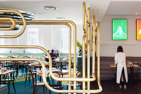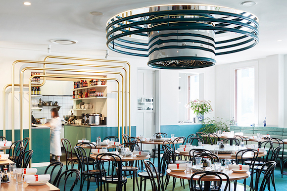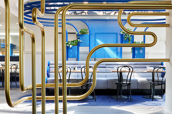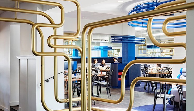 负责这家门店设计的是本土事务所Sibling建筑公司。设计师们以1970年代的城郊多元文化为灵感,选用有着电子科技感的金属管子作为整个空间的重要装饰,配合以金色、蓝色、黑色的配色,让餐厅显得有些清新,却又不失厚重的感觉。金属管子们另一方面也起到了空间分割以及引流的作用,整个餐厅的人流动线和金属管子的铺设位置基本重合。而颜色上,整家餐厅天为蓝,地为绿,冷色调为主,却又用了金色添了些温度和人气。这样的设计风格,让青花瓷花瓶在其中也显得不突兀。
