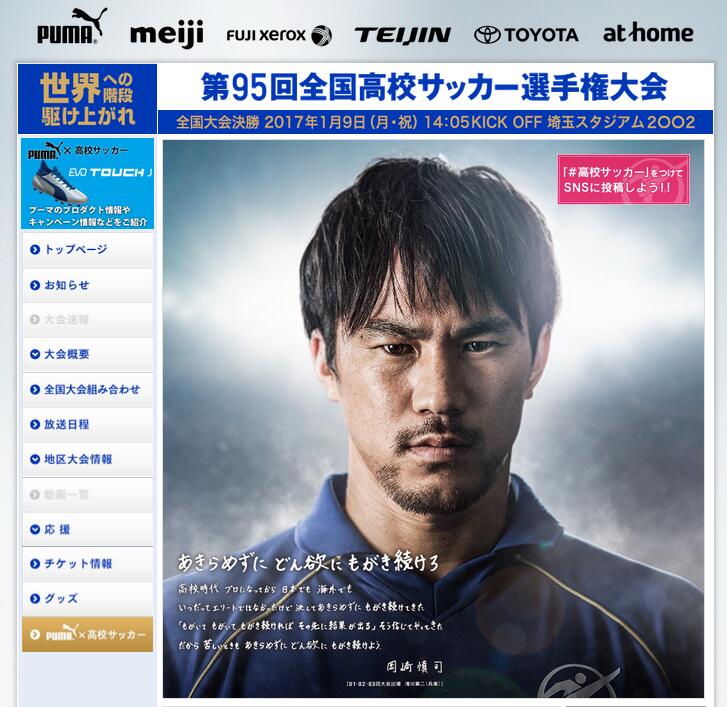 身为本届全国大赛的宣传大使,现效力于莱斯特城的冈崎慎司出现在了大会官方网站上,配有一张气势如虹的照片,这位日本国脚写下了自己的独白:“自从高中毕业成为职业球员后,无论国内还是国外,我都不轻言放弃。虽然不是出类拔萃的顶级球员,但我一直怀揣着贪婪的欲望拼搏着。就算翻滚、挣扎,只要坚持下去,就一定会有结果。正因坚守着这一信念,即便是遇到困难和挫折,我们也要像饿死鬼一样贪婪地前行……”