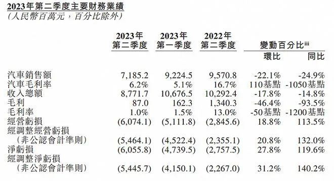 今年8月底,蔚来-SW(09866)公布了截至2023年上半年的第二季度未经审计的财务业绩。数据显示,蔚来汽车2023年第二季度营收87.717亿元,同比下降14.8%;毛利润8700亿元,同比下降93.5%;净亏损60.558亿元,同比增长119.6%;调整后的净亏损为54.457亿元,同比增长140.2%。