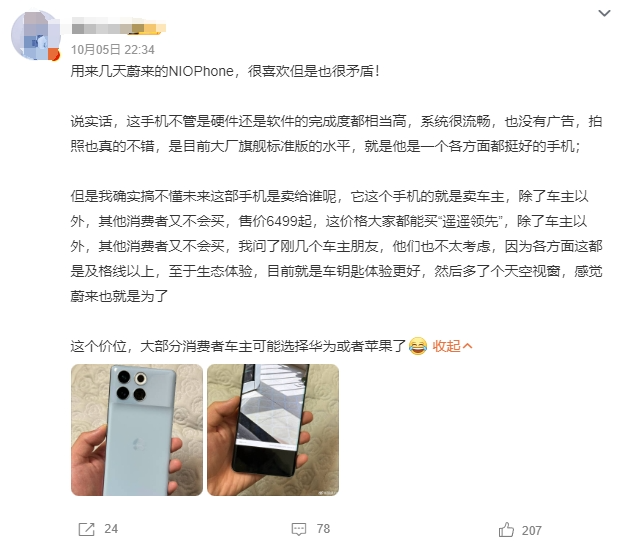 但在不少用户眼中却并非如此。在社交平台上,不少网友吐槽称“让蔚来适配更多机型反而更容易,单独再买一台手机的概率不大,买车送手机还差不多。”“明明是一个app能搞定的事,非要去开发一个手机!”关于蔚来手机卖给谁的话题也引发了广泛讨论。