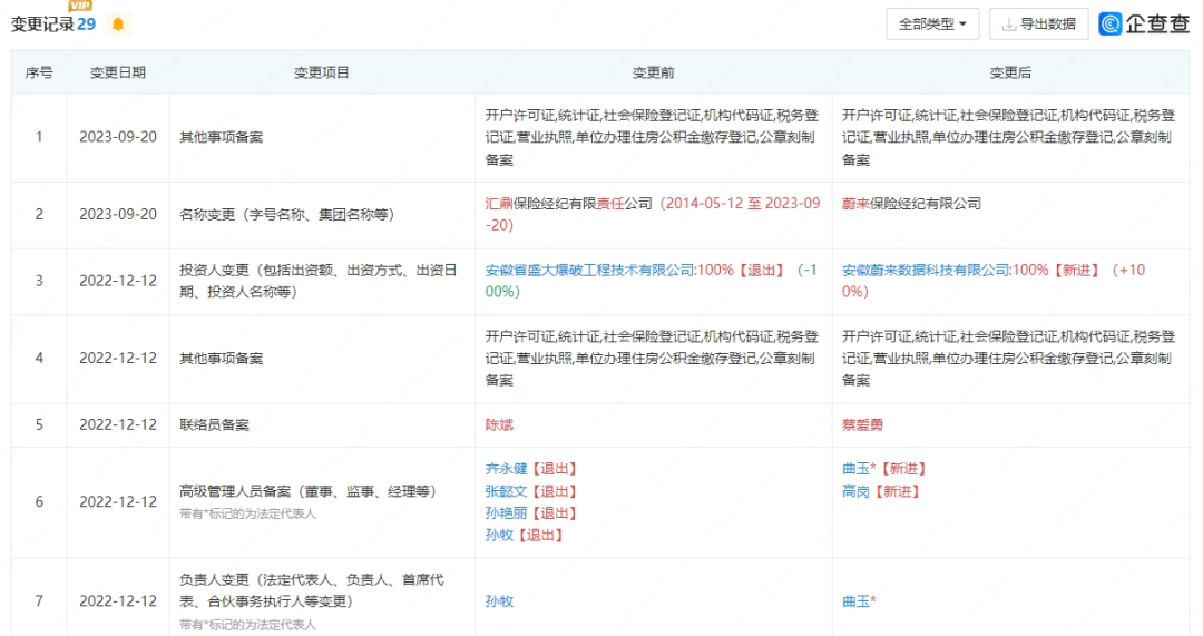 但这并未打消蔚来在保险市场开拓的决心,转而寻找“曲线”入局路线。2022年12月,蔚来创始人李斌实控的安徽蔚来数据科技有限公司全资入股汇鼎保险经纪,之后原高管也陆续退出。后直至今年9月,汇鼎保险经纪改名为蔚来保险经纪,蔚来汽车在自身保险业务上才终于走上正规。