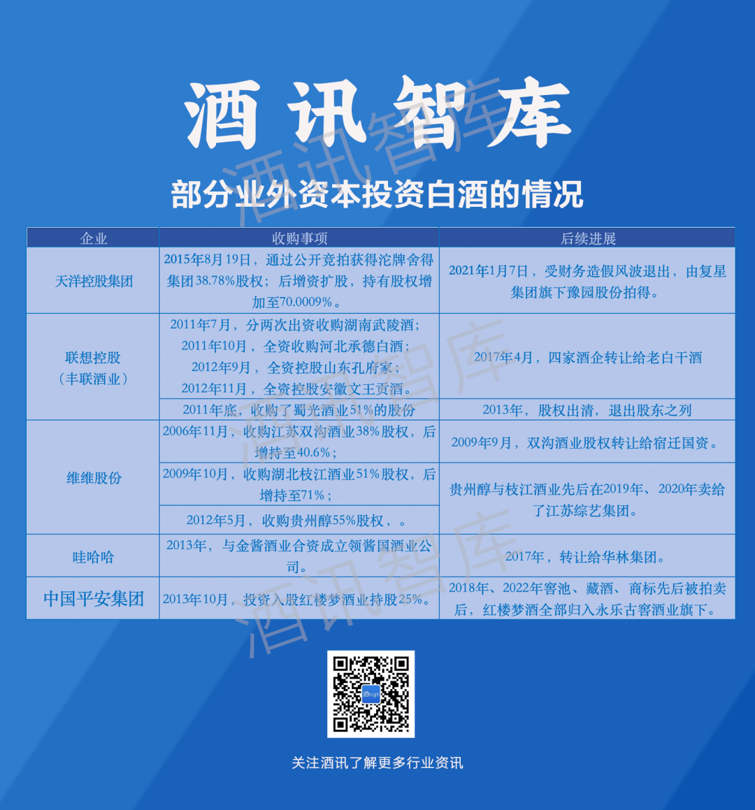 当然,有酒意的“大树”不仅多且背景丰富,有“泰国酒王”TCC集团、投资银行高盛集团、奢侈品集团LVHM等海外资本,也有联想控股、天洋集团、维维股份这样的国内跨界资本入局涉酒,更有老白干酒、古井贡酒等一批白酒企业收拢势力。