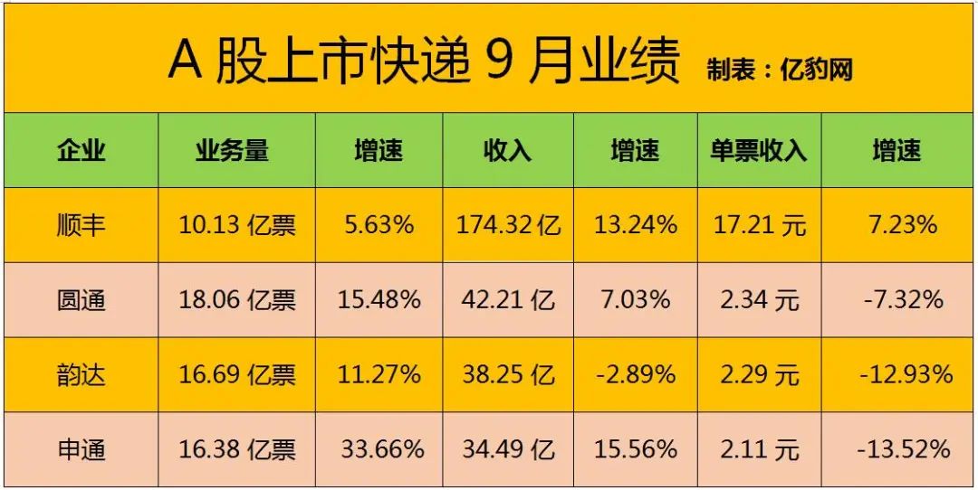 10月19日晚间,A股上市快递相继发布9月业绩显示,四家快递业务量全部实现增长,申通增速继续领跑,除顺丰单票收入增长7.23%外,两通一达三家继续下滑,价格较量依然激烈。