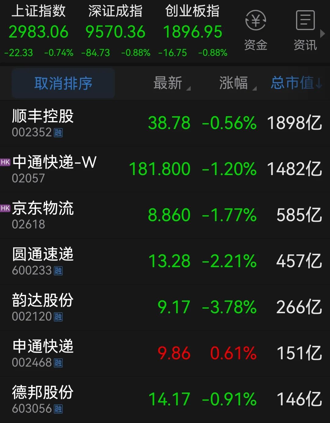 股价跌跌不休,今年以来,顺丰已累计下跌32.57%、圆通下跌33.06%、韵达下跌36.01%、京东物流下跌41.04%。快递股市值也随之继续走低,顺丰最新总市值为1898亿元、中通1482亿港元、京东物流585亿港元、圆通457亿元、韵达266亿元、申通151亿元。