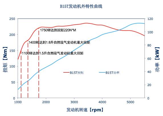 从图上可以看出,B15T发动机在1100转达到1.5升自然吸气发动机最大扭矩、在1400转达到1.8升自然吸气发动机扭矩输出、最大扭矩媲美2.4L自然吸气, 爬坡动力强劲。