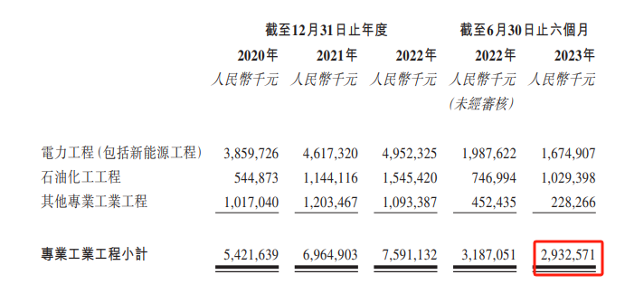 其中专业工业工程为公司核心业务,2023年上半年该业务实现营收29.33亿元,占公司收入比例为55.87%。专业工业工程又分为电力工程、石油化工工程以及其它工程三部分。