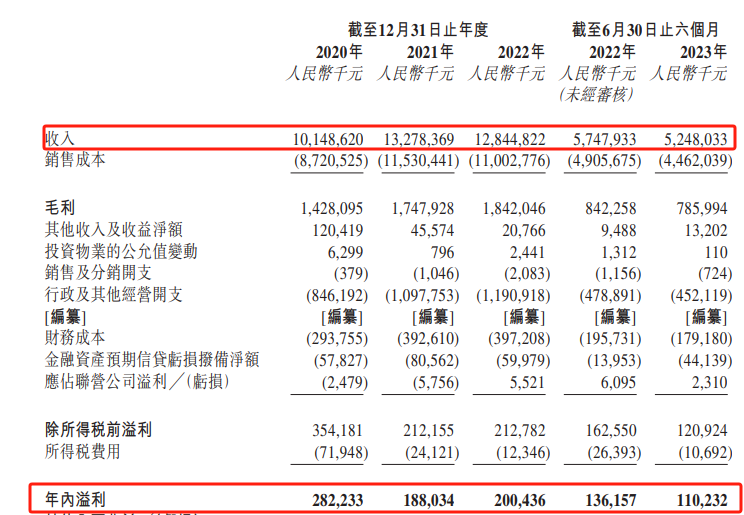 招股书显示,2020年至2022年(以下简称“报告期内”)公司收入分别为101.49亿元、132.78亿元、128.45亿元。同期公司利润分别为2.82亿元、1.88亿元、2亿元。