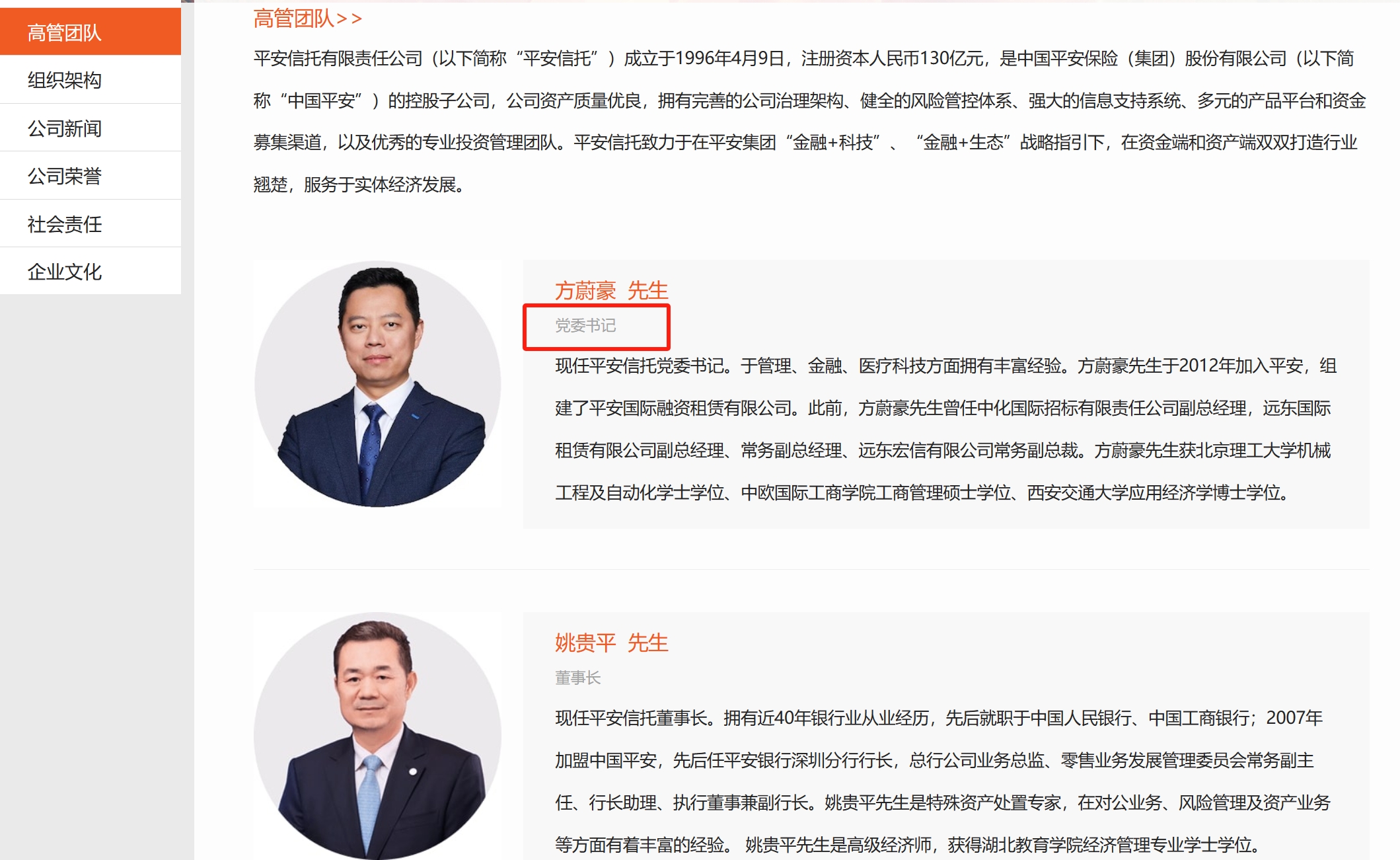 界面新闻查阅平安信托官网发现,目前,公司官网高管介绍一栏确已完成变更。方蔚豪任公司党委书记,姚贵平目前仍担任董事长职务。