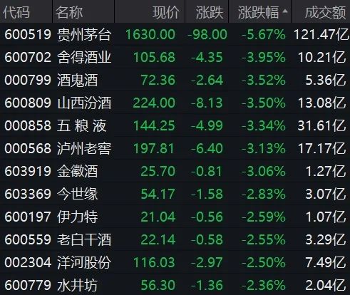 而就在贵州茅台股价下跌的同一日,泸州老窖、五粮液、山西汾酒、舍得酒业等个股,跌幅也超过3%。到底是发生了什么?