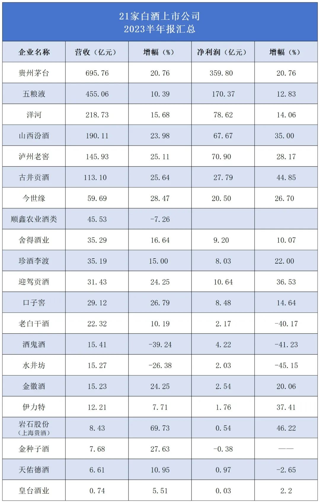 半年报显示,21家白酒上市企业累计总营收 2158.84亿元,较去年同期(2022上半年营收1819.15亿)绝对值增加了339.69亿元(含珍酒李渡上半年营收35.2亿),增幅为16.7%。