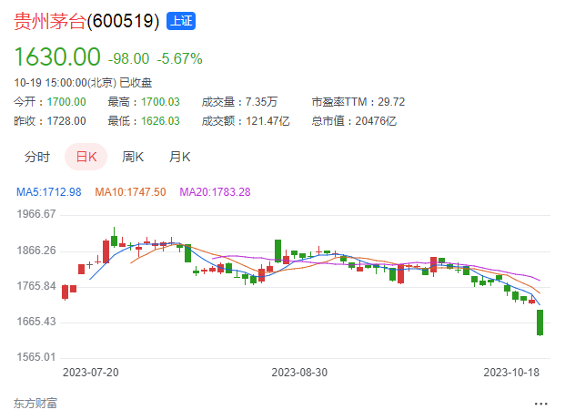 10月19日,贵州茅台股价突然跳空低开,随后放量持续下行,截至收盘跌幅达到5.67%,报收1630元/股。需要大家注意到的是,这也是贵州茅台今年以来创下的单日最大股价跌幅。