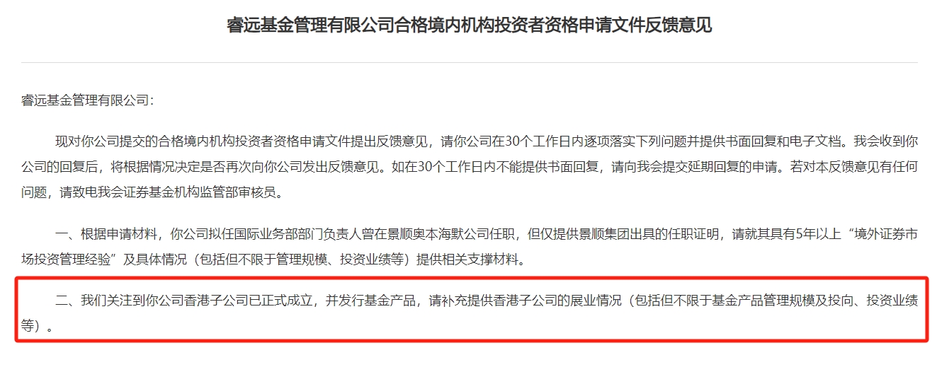 今年3月末,睿远基金向证监会提交合格境内机构投资者申请。10月20日,证监会公布了对该申请的反馈意见。