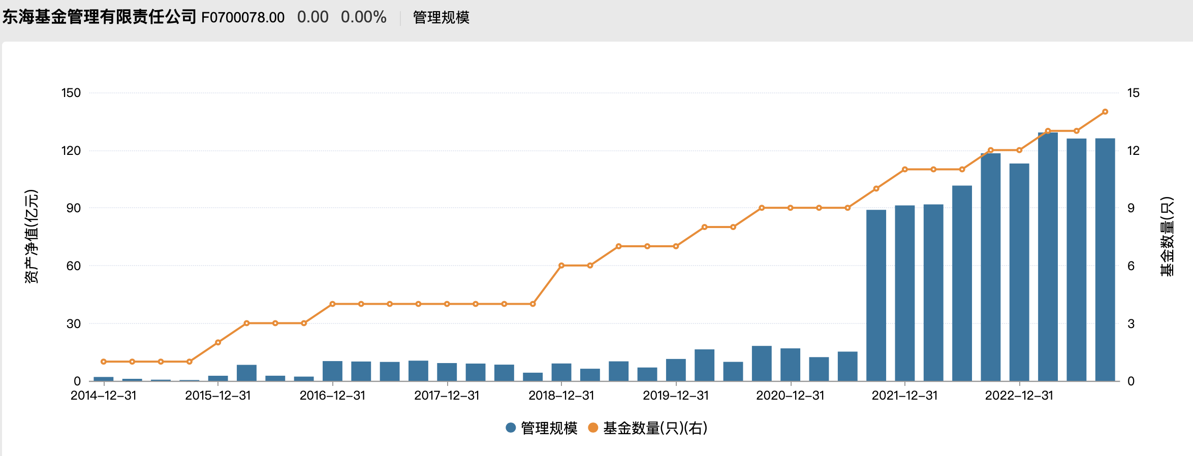 截至最新,东海基金旗下基金管理规模合计126.23亿元。自2021年开始,东海基金的管理规模迅速增长。具体来看,主要是债券型基金规模贡献了增长。