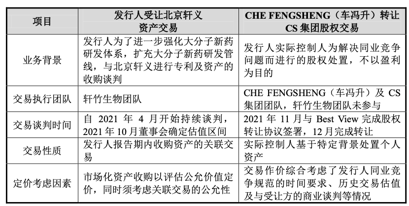 “鉴于北京轩义自2020年5月CS集团股权转让交易时,至2021年11月期间仍存在持续性的产品研发及资产购置,发行人受让北京轩义专利及资产的评估结果体现了北京轩义产品研发最近进展和新增资产情况,因此发行人受让北京轩义专利及资产价格,高于车冯升出售CS集团股权对价。”轩竹生物表示。