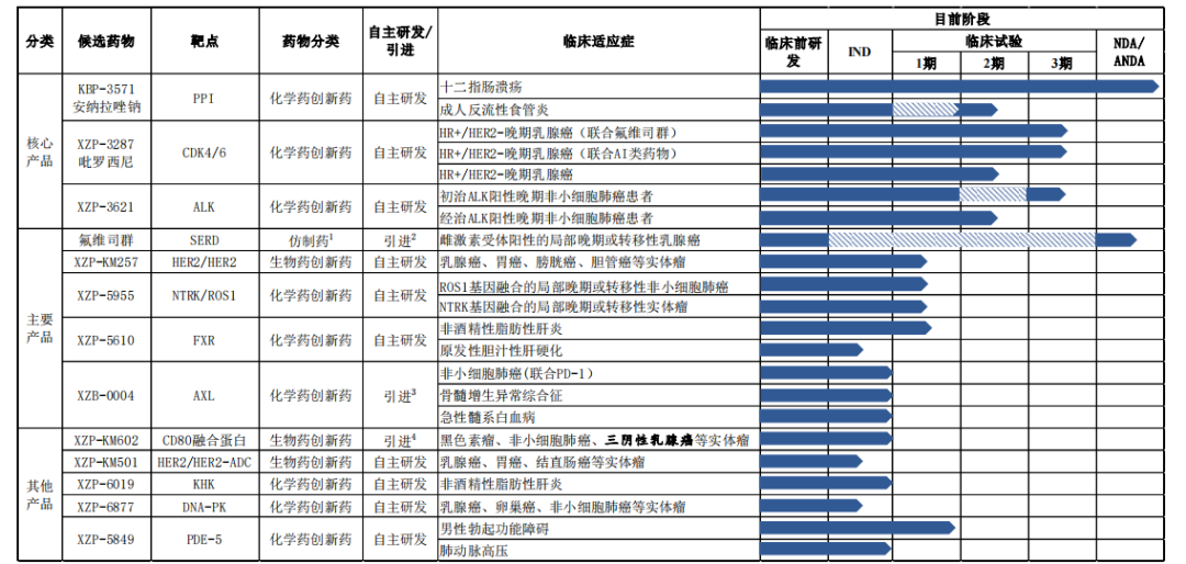 轩竹生物共有三大类核心产品,速度最快的为KBP-3571即为安纳拉唑钠肠溶片,主要用于治疗成人十二指肠溃疡,已获国家药监局批准上市;其次为治疗晚期乳腺癌的两款XZP-3287吡罗西尼片剂系CDK4/6抑制剂;以及治疗ALK重排晚期非小细胞肺癌的XZP-3621,即酪氨酸激酶抑制剂口服片剂,均处于临床III期研究阶段。