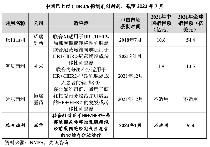 其次是治疗乳腺癌的XZP-3287吡罗西尼片剂,截至2023年7月,国内有4款获得NMPA批准上市的CDK4/6抑制剂创新药,分别为辉瑞的哌柏西利、礼来的阿贝西利、恒瑞的达尔西利以及诺华的瑞波西利。其中辉瑞的哌柏西利2021年在国内销售额达到10.6亿元。