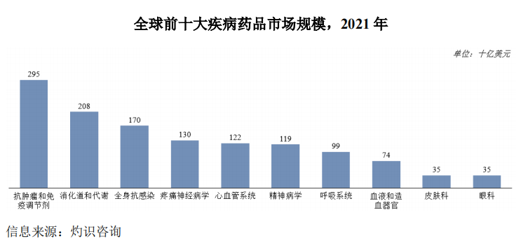 近年来,随着人口老龄化以及全球各国对于医疗的重视,医药成为各大资本涉足的领域。各类疾病中,抗肿瘤和免疫调节剂、消化道和代谢、全身抗感染为全球前三大疾病药品市场规模。