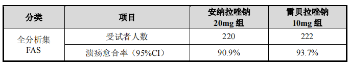 《招股书》提到,临床结果显示,安纳拉唑钠20mg治疗组,对于十二指肠溃疡愈合率为90.9%,低于雷贝拉唑钠10mg治疗组的93.7%。