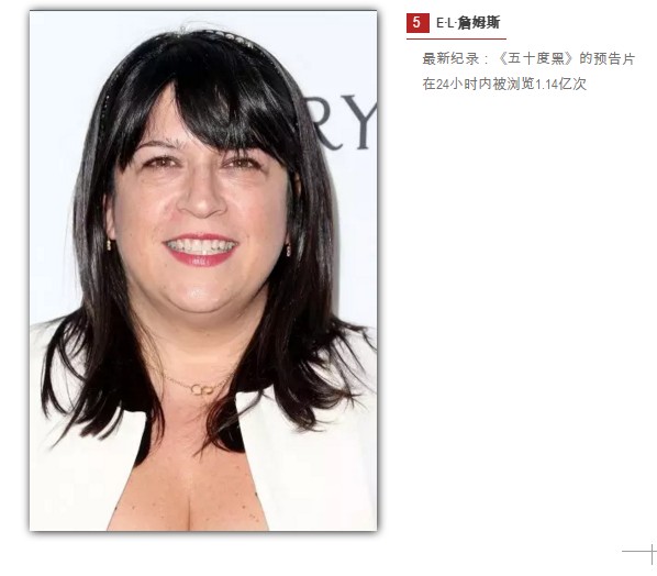 《五十度》系列的热度没有任何减弱的迹象,《格雷》,詹姆斯以格雷的视角重写的《五十度灰》的故事是2015年畅销书排行榜的第2位(售出约140万本,与此同时原版三部曲的销量也冲上了高峰)。上述成绩,以及《五十度黑》创下的预告片浏览记录,53岁的詹姆斯认为这应当是“一次对电影制作者们有力的警醒,表明现在有着一个充满活力而热情的女性观众群体,她们关于商业性爱题材电影的需求被好莱坞所冷落了。”很少有人能够像詹姆斯一样明智地利用这些需求,她通过谈判成为了影片的制作人之一,对影片具有控制权。她的丈夫、电视编剧尼尔·伦纳德担任这部续集电影(明年2月上映)的编剧(她开玩笑说她要求丈夫花更多的预算来拍这部电影。)