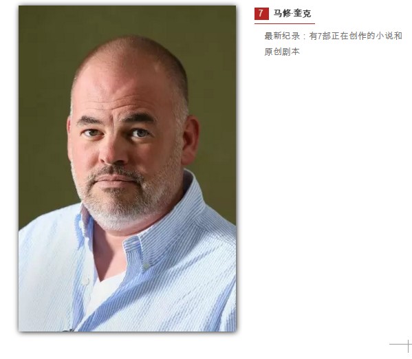 好莱坞总是不乏关于作家们的笑话——而所有这些笑话的妙点就在于作家们是如何人微言轻。但这个25位娱乐业最有影响力的作家榜单说明,在这个行业里已经没人再敢嘲笑作家了。联合艺人经纪公司(UTA)合伙人、图书部门联合主管豪伊·桑德斯就目前对书籍与杂志文章的电影电视改编权的争夺战评论道:“对创作者和故事的需求从没有像现在这样强烈。”《权力的游戏》(榜上第4位的乔治·R·R·马丁)、FX电视网的《美国犯罪故事》(榜上第20位的杰弗里·图宾)以及《11.22.63》(榜上第2位的斯蒂芬·金)的成功,引起了业界将长篇故事搬上电视或流媒体平台上映的兴趣。明年我们将会见到许多备受瞩目的连续剧,如玛格丽特·阿特伍德(榜单第16位)原著,将在Hulu视频网开播的《使女的故事》、尼尔·盖曼(榜单第9位)原著,Starz电视台制作的《美国众神》和丽恩·莫里亚蒂(榜单第18位)原著,HBO制作的《大小谎言》。制作这一份榜单(图书销量、改编数量、正在筹划的项目数量、其他加分项和文化上的影响都将被考量进入排名中)将比以往更为困难,许多新晋作家进入了这个榜单,包括欧内斯特·克莱因(榜单第12位),他的《玩家一号》改编的电影正在制作中,导演是史蒂芬·斯皮尔伯格;以及宝拉·霍金斯(榜单第19位),她的《火车上的女孩》是今秋最具期待值和话题性的影片之一;还有劳伦·奥利弗(榜单第23位),她的青少年畅销小说《忽然七日》改编的电影将于明年4月在北美院线上映。