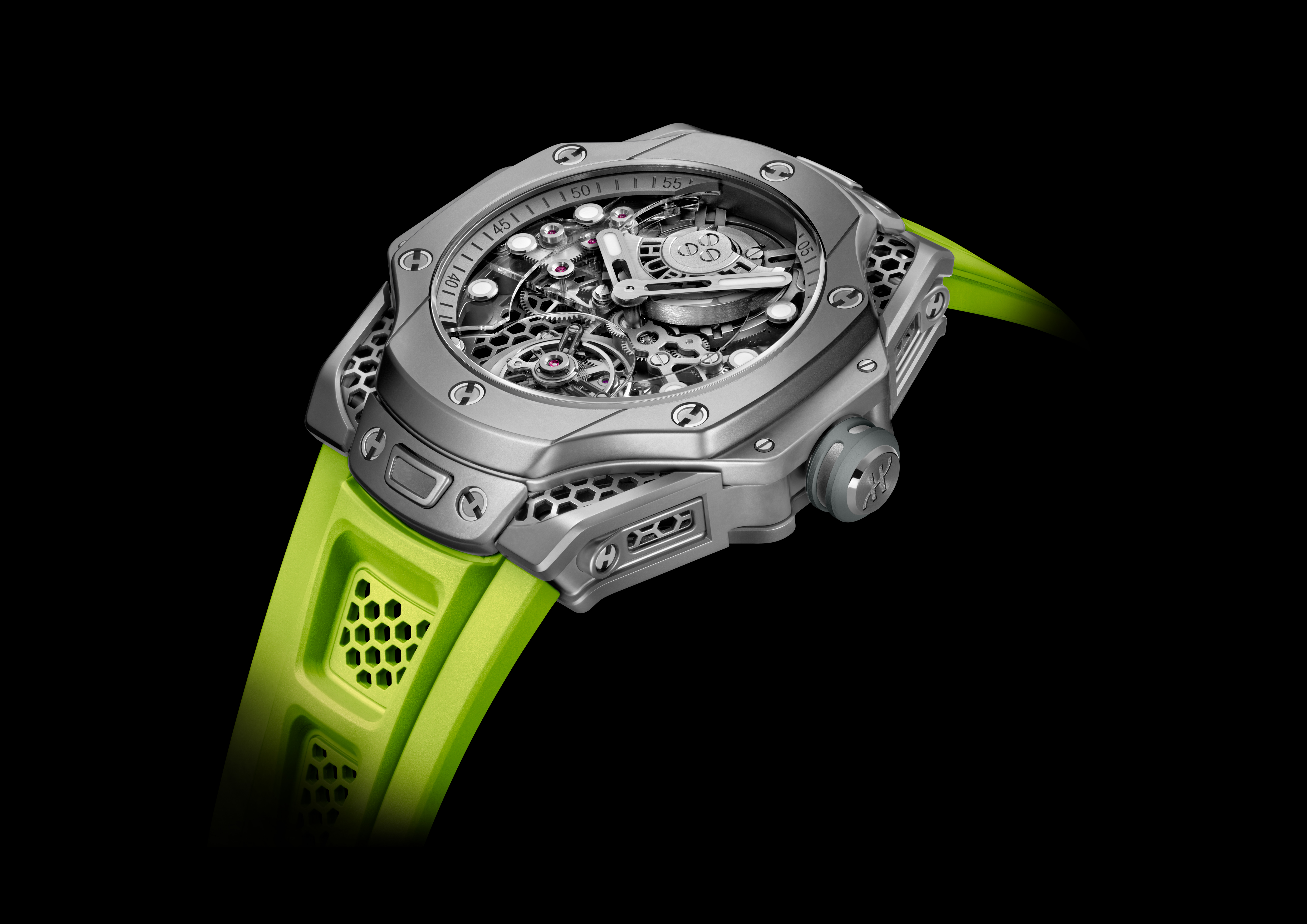 此款腕表将全新设计元素引入表壳、表冠、表盘、表带以及表圈之中。全新腕表以他和宇舶表合作的首款腕表为蓝本打造,表壳通体采用灰色配色,并提供电光绿、黑色及白色三款橡胶表带。