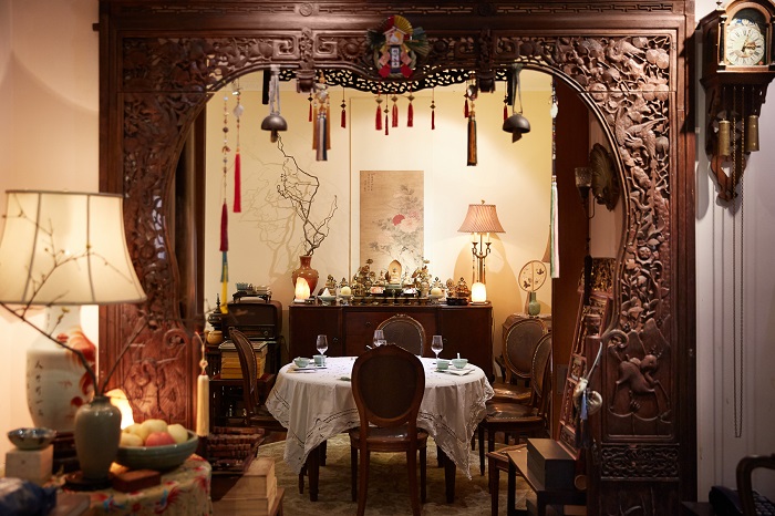 这幢老建筑是建于 40 年代的西式公寓,种着百岁古树的大花园正对澄园大门,老板养的白猫时不时在草丛里撒欢,环境私密惬意。推开玻璃门,仿佛走进上世纪三十年代的老上海人家,老式木质家具、地毯、镂空木门廊、还有各式各样的老式摆件占满整个空间,暖色调的光线充盈着整间屋子,依稀能听见包房里老式收音机传出来的昆曲。
