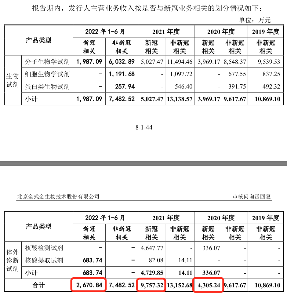 根据2022年12月30日披露的回复,2022年上半年全式金新冠相关业务收入为2670.84万元,未足2021年的一半,占到了2022年上半年全部收入的26.3%,远低于2021年的42.59%。