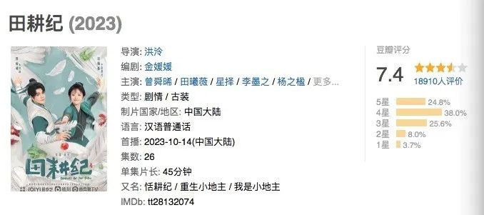 断更后的首个更新日,《田耕纪》在猫眼剧集热度榜上的霸榜势头被打破,豆瓣评分也下滑至7.4分。——今年8分剧“爆发”的剧集市场,这个成绩不算好。
