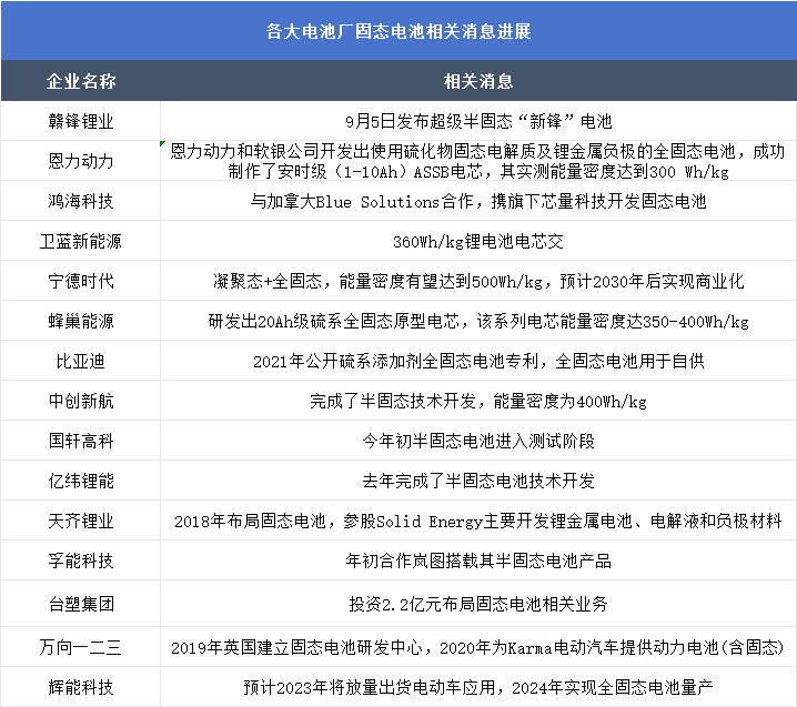 目前全球的电池厂中,大多数头部企业以及部分实力雄厚的初创企业,进入了固态电池的研发,在国内大部分企业先从逐渐降低电池中的电解液含量入手,先后推出半固态电池。