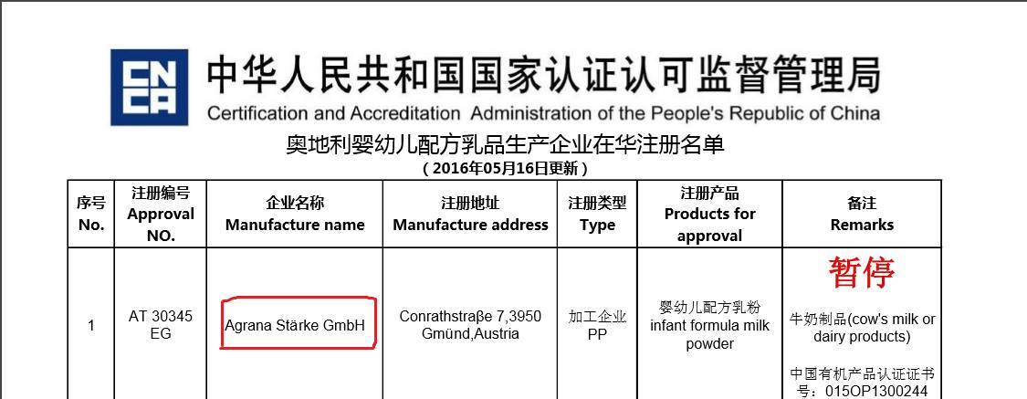然而,国家认监委在官方网站上更新信息,暂停泓乐生产厂商即Agrana St rke GmbH在华注册资格。