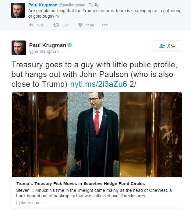 但比你聪明、比你成功且比你专业的诺贝尔经济学家克鲁格曼想要告诉你,在他看来,市场对“特朗普经济学的理解有误”。在前日在NYT专栏上从经济学角度阐述“特朗普经济学”的问题后,今日其在Twitter上再度撰文阐述此观点,并从特朗普团队构成角度上分析,为什么市场指望特朗普进行刺激政策来推高通胀的想法不现实,并称特朗普的经济团队为“黄金疯子(Gold Bugs)”。