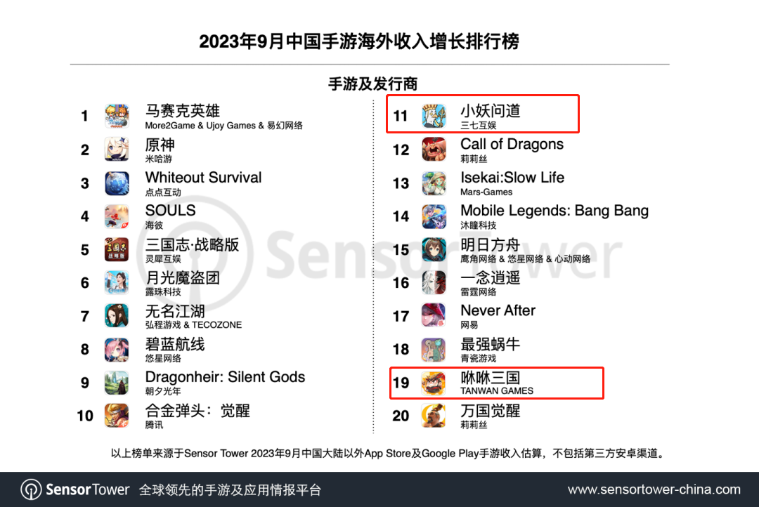 比如仅在Sensor Tower发布的9月中国手游海外收入增长排行榜上面,就有两个我们熟悉的爆款小游戏,它们就是来自三七互娱的《小妖问道》(寻道大千)和贪玩游戏的《咻咻三国》(三国吧兄弟)。