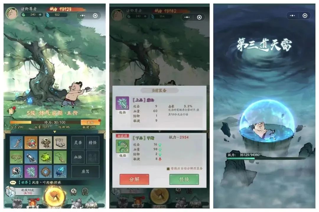 玩法上,海外版本和国内一脉相承,仍以砍树(开箱子)为核心。不过为了降低海外玩家的理解成本,出海版本的背景设定相较国内略有调整,主要是将妖怪砍树修仙的设计替换成了《西游记》师徒四人砍树收集神装。站在我国最强IP之一“西游记”的广大影响力之上,《寻道大千》的出海之路开始了。